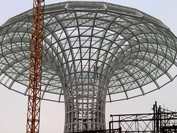 二、球形网架结构因其结构新颖,受力合理,自重轻、用钢量低等优点。如大型体育场馆球形安庆螺栓球网架、公共场馆球形网架、电厂安庆螺栓球网架、水泥工业球形网架、仓储物流球形网架、安庆干煤棚工业球形网架、安庆收费站安庆加油站球形网架、展览中心、影剧院、商场、航站楼、候车厅、工厂安庆车间、仓库、电视塔等球形螺栓球节点网架。国内球形网架结构主要分为:安庆焊接球节点网架及螺栓球节点网架两种。螺栓球节点网架其构件工厂内加工量较大,现场安装便捷,适用于现场工期紧,安庆施工条件、用电量受制约,网架形状复杂、安庆杆件定位困难的异形结构。螺栓球节点球形网架系统基本由安庆杆件、螺栓球、支撑支座等组成。按照节点形式可分为交叉安庆桁架体系、四角锥体系、三角锥体系等。支撑方式多为固定支座支撑。对于大面积、大跨度及有特殊受力或伸缩要求的网架结构可采用橡胶支座、滑移支座、球铰支座等支撑形式,以满足结构自身的受力稳定、均衡,便于内力释放等设计要求。